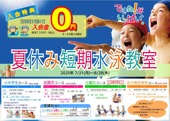 27日 8月 2025 7/21~8/27夏休み短期教室 今年の夏も開催!夏休み短期教室 初心者コースも募集、25M以上泳げる方は泳力検定にもチャレンジできます。 泳力検定の資格をGETしましょう。 tagPlaceholderカテゴリ: